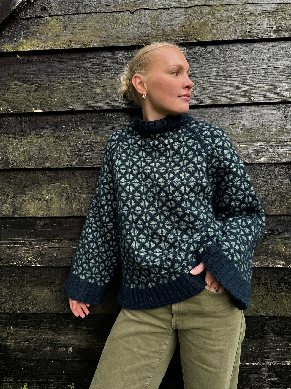 Drømmegenseren strikkes nedenfra og opp, enten i én tråd Sol fra Hillesvåg sammen med én tråd Brushed Alpaca Silk fra Drops eller i én tråd Varde pelsull fra Hillesvåg.